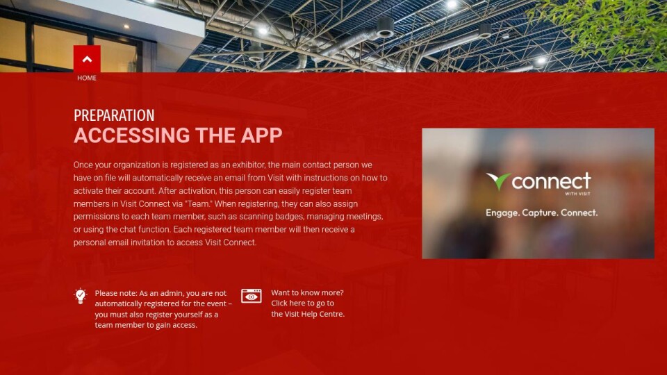 Once your organization is registered as an exhibitor, the main contact person we have on file will automatically receive an email from Visit with instructions on how to activate their account. After activation, this person can easily register team members in Visit Connect via "Team." When registering, they can also assign permissions to each team member, such as scanning badges, managing meetings, or using the chat function. Each registered team member will then receive a personal email invitation to access Visit Connect.
