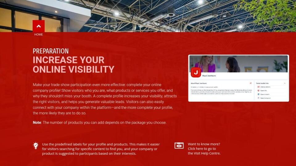Make your trade show participation even more effective: complete your online company profile! Show visitors who you are, what products or services you offer, and why they shouldn't miss your booth. A complete profile increases your visibility, attracts the right visitors, and helps you generate valuable leads. Visitors can also easily connect with your company within the platform—and the more complete your profile, the more likely they are to do so.