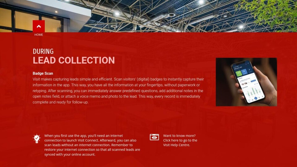 Visit makes capturing leads simple and efficient. Scan visitors' (digital) badges to instantly capture their information in the app. This way, you have all the information at your fingertips, without paperwork or retyping. After scanning, you can immediately answer predefined questions, add additional notes in the open notes field, or attach a voice memo and photo to the lead. This way, every record is immediately complete and ready for follow-up.