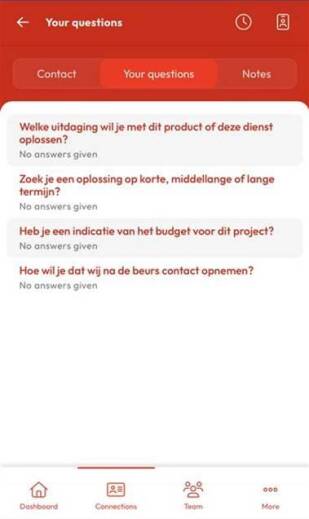 With (Visit) Connect, you not only collect leads but also ensure they're immediately valuable. Create predefined questions that you can easily answer after scanning a visitor. This way, you can qualify your leads directly during the event, without wasting time afterward figuring out who's interested in which products or services.