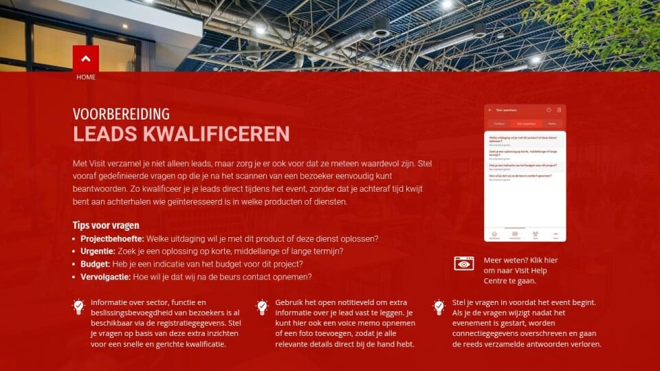 Met Visit verzamel je niet alleen leads, maar zorg je er ook voor dat ze meteen waardevol zijn. Stel vooraf gedefinieerde vragen op die je na het scannen van een bezoeker eenvoudig kunt beantwoorden. Zo kwalificeer je je leads direct tijdens het event, zonder dat je achteraf tijd kwijt bent aan achterhalen wie geïnteresseerd is in welke producten of diensten.