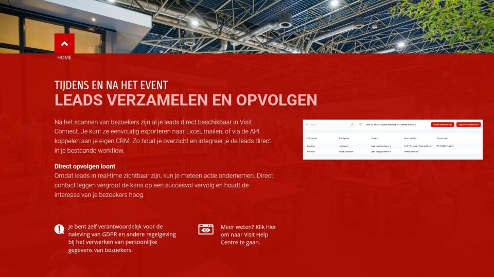 Na het scannen van bezoekers zijn al je leads direct beschikbaar in Visit Connect. Je kunt ze eenvoudig exporteren naar Excel, mailen, of via de API koppelen aan je eigen CRM. Zo houd je overzicht en integreer je de leads direct in je bestaande workflow.