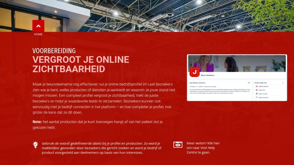 Maak je beursdeelname nog effectiever: vul je online bedrijfsprofiel in! Laat bezoekers zien wie je bent, welke producten of diensten je aanbiedt en waarom ze jouw stand niet mogen missen. Een compleet profiel vergroot je zichtbaarheid, trekt de juiste bezoekers en helpt je waardevolle leads te verzamelen. Bezoekers kunnen ook eenvoudig met je bedrijf connecten in het platform – en hoe completer je profiel, hoe groter de kans dat ze dit doen.